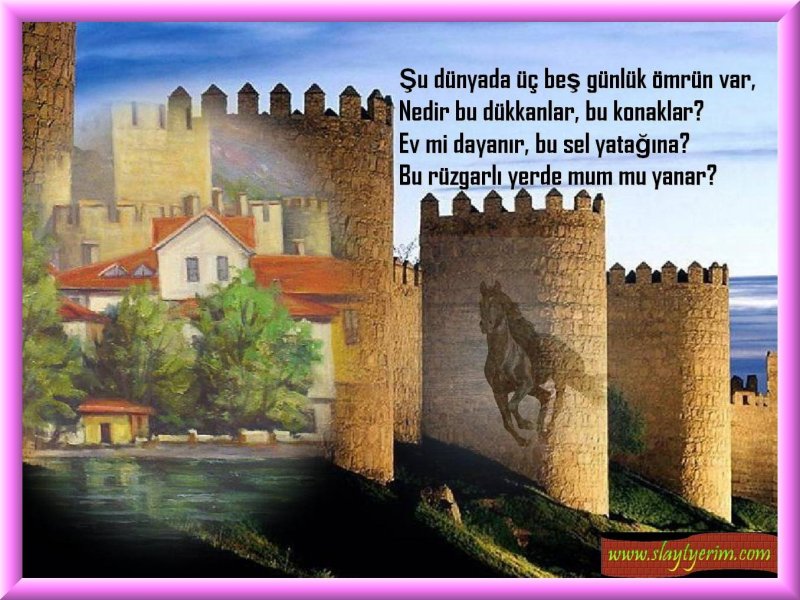 Şu dünyada üç beş günlük ömrün var, nedir bu dükkanlar, bu konaklar ? Ev mi dayanır , bu sel yatağına ? Bu rüzgarlı yerde mum mu yanar ?