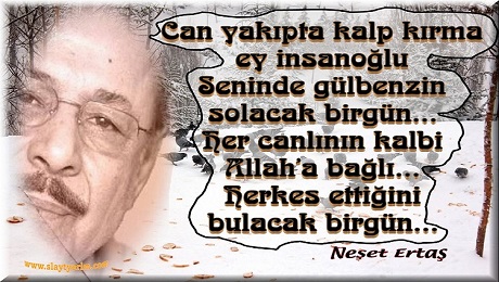 Can yakıpta kalp kırma ey insanoğlu. Seninde gülbenzin solacak birgün... Her canlının kalbi Allah'a bağlı... Herkes ettiğini bulacak birgün...Neşet ERTAŞ