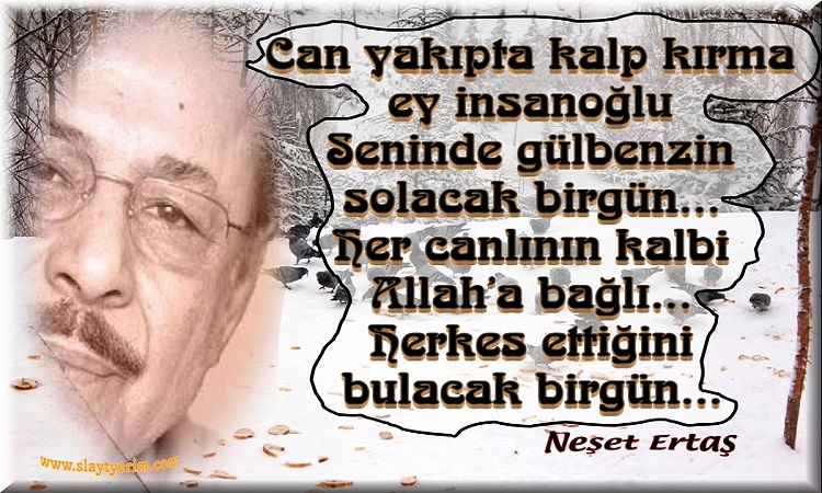 Can yakıp kalp kırma ey insanoğlu, Senin de gül benzin solacak bir gün, Her canlının kalbi Allah'a bağlı, Herkes ettiğini bulacak bir gün. Neşet ERTAŞ